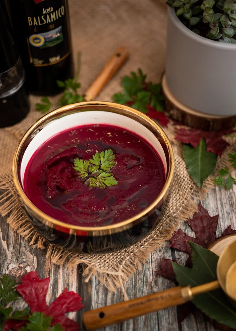 Topla jesenska juha z rdečo peso, timijanom in balzamičnim kisom. Odlična predjed v hladnejši polovici leta, ki navdušuje s svojimi aromami in kombinacijami okusov. Za osnovo uporabimo mešanico rdeče pese in buče, da poskrbimo za primerno gostoto in nežno sladek okus. Rdeča pesa je odlično živilo za vse, ki jim primankuje železa.