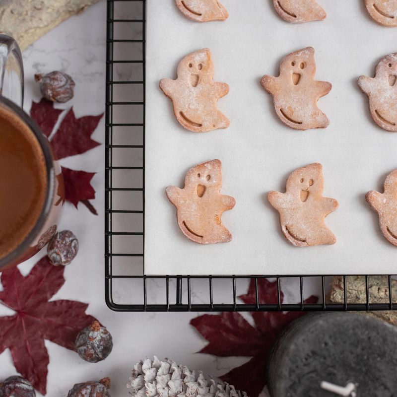 Čas je za strašljive piškote – tukaj je nov halloween recept za hrustljave duhce! To so piškoti brez glutena, saj sta namesto običajne moke uporabljeni tapiokina in mandljeva moka. Končni piškotki so prijetno krhki in ravno prav sladki. Po želji lahko med dva piškota namažete nekaj marmelade in tako še dodatno popestrite recept. Peka teh piškotov bo preprosta, recept pa je uporaben tudi za preostale praznike v letu – uporabite ga za decembrske linške oči ali pa velikonočne piškotke.