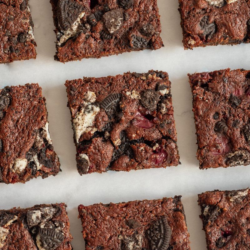Ti sočni oreo browniji z višnjami bodo navdušili tako otroke kot odrasle. Za brownije že leta uporabljam en in isti recept, ki je moj daleč najljubši. Tokrat sem se z njim malo poigrala in rezultat je naravnost vrhunski. Browniji so ravno prav mehki, višnje poskrbijo za sočnost, oreo piškoti pa so odličen sladek dodatek. To verzijo brownijev lahko pripravite na ogromno načinov in oreo pišktoe zamenjate za oreščke, kosmiče ali kakšne druge piškote. Tudi višnje lahko izpustite in namesto njih uporabite jagode ali banane – ne bojte se eksperimentirati. Za recept popolnoma brez olja in še več idej, preverite nasvete.
